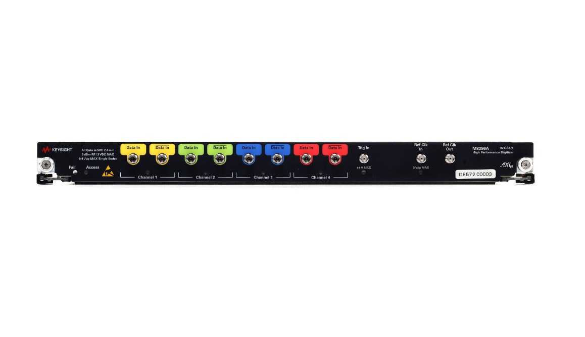 Keysight M8296A – высокоскоростной электрический дигитайзер AXIe. Частота дискретизации 92 Гвыб/с, 4 канала, память 512 Квыб/канал. Идеален для захвата и анализа быстрых электрических сигналов в передовых R&D.