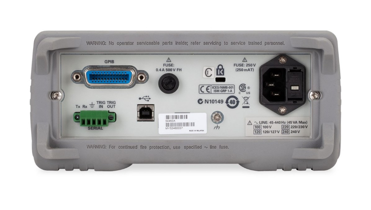 - Расширенные возможности подключения и анализа: Мультиметр 34450A оснащён интерфейсами USB 2.0 и GPIB (опционально), что обеспечивает гибкость при интеграции в автоматизированные измерительные системы. Прибор поставляется с программным обеспечением, которое позволяет удаленно управлять мультиметром, собирать и анализировать данные, а также создавать отчёты.