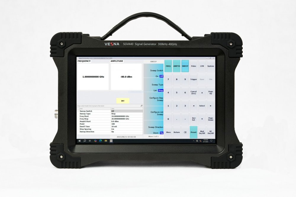 Vesna SGVA40 — аналоговый генератор сигналов до 40 Гигагерц (ГГц). Отличается низким фазовым шумом -122дБн/Гц, высокой стабильностью и точностью уровня (-90 до +15 дБмВт). Поддерживает ИМ (импульсную модуляцию). Идеален для СВЧ/РЛС-тестов.