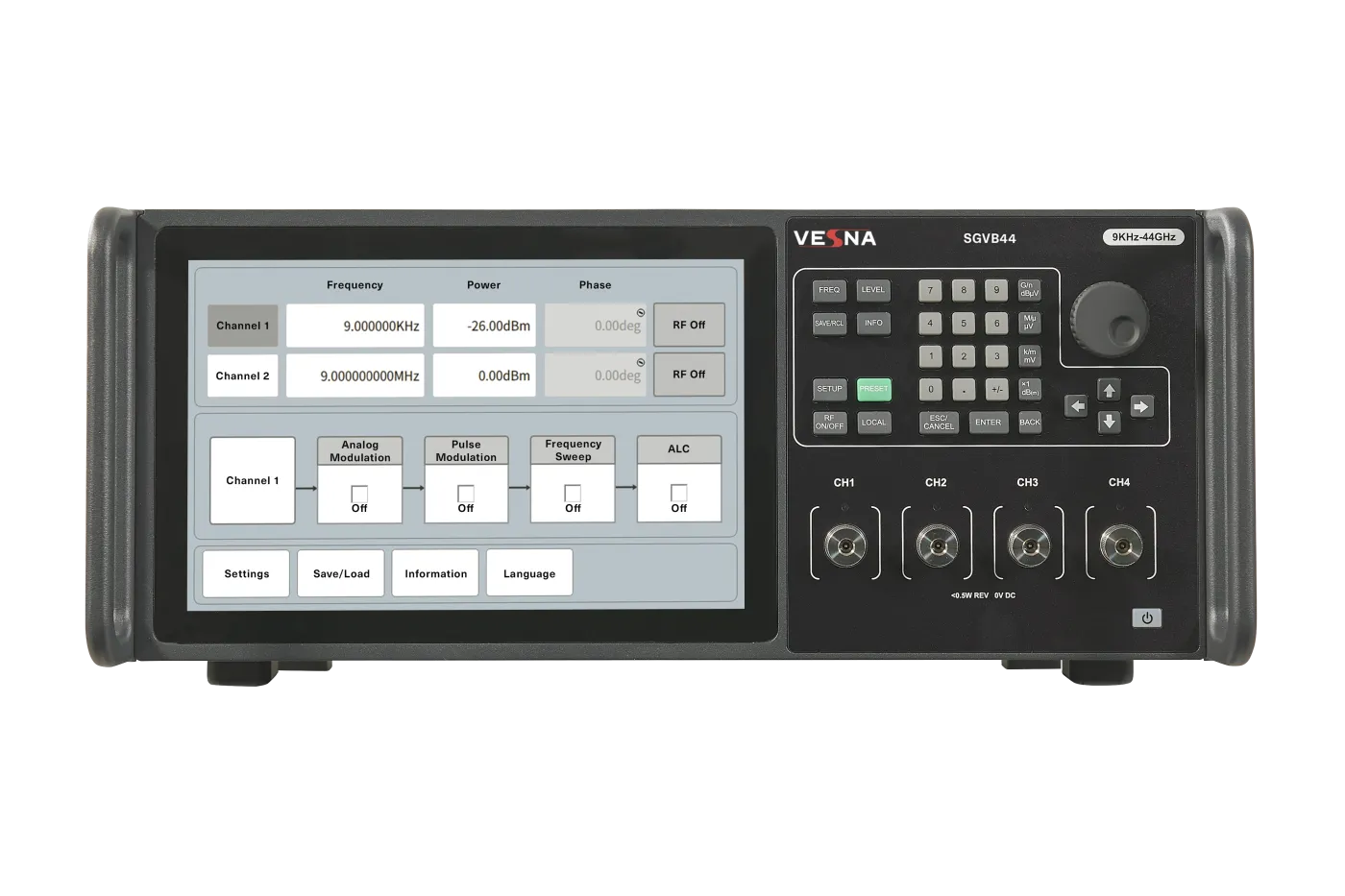 Vesna SGVB44 — аналоговый генератор сигналов, 9 кГц – 44 ГГц, фазовый шум –140 дБн/Гц @10 кГц, выходная мощность от –130 до +17 дБм, погрешность уровня ±1.0 дБ. Поддерживает импульсную модуляцию (фронт ≤40 нс, подавление ≥50 дБ). Управление — через LAN и USB. Предназначен для метрологии, калибровки, радиолокации и СВЧ-компонентов до 44 ГГц.