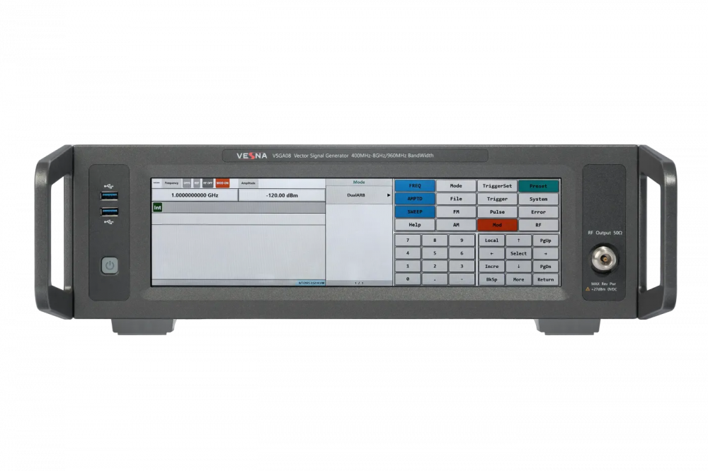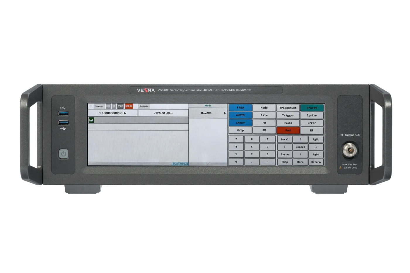 Vesna VSGA08 — векторный генератор сигналов до 8 Гигагерц (ГГц). Полоса модуляции до 960 МГц (опционально). Широкий динамический диапазон (-120 до +20 дБм). Идеален для тестирования 5G (Sub-6 GHz) и Wi-Fi.