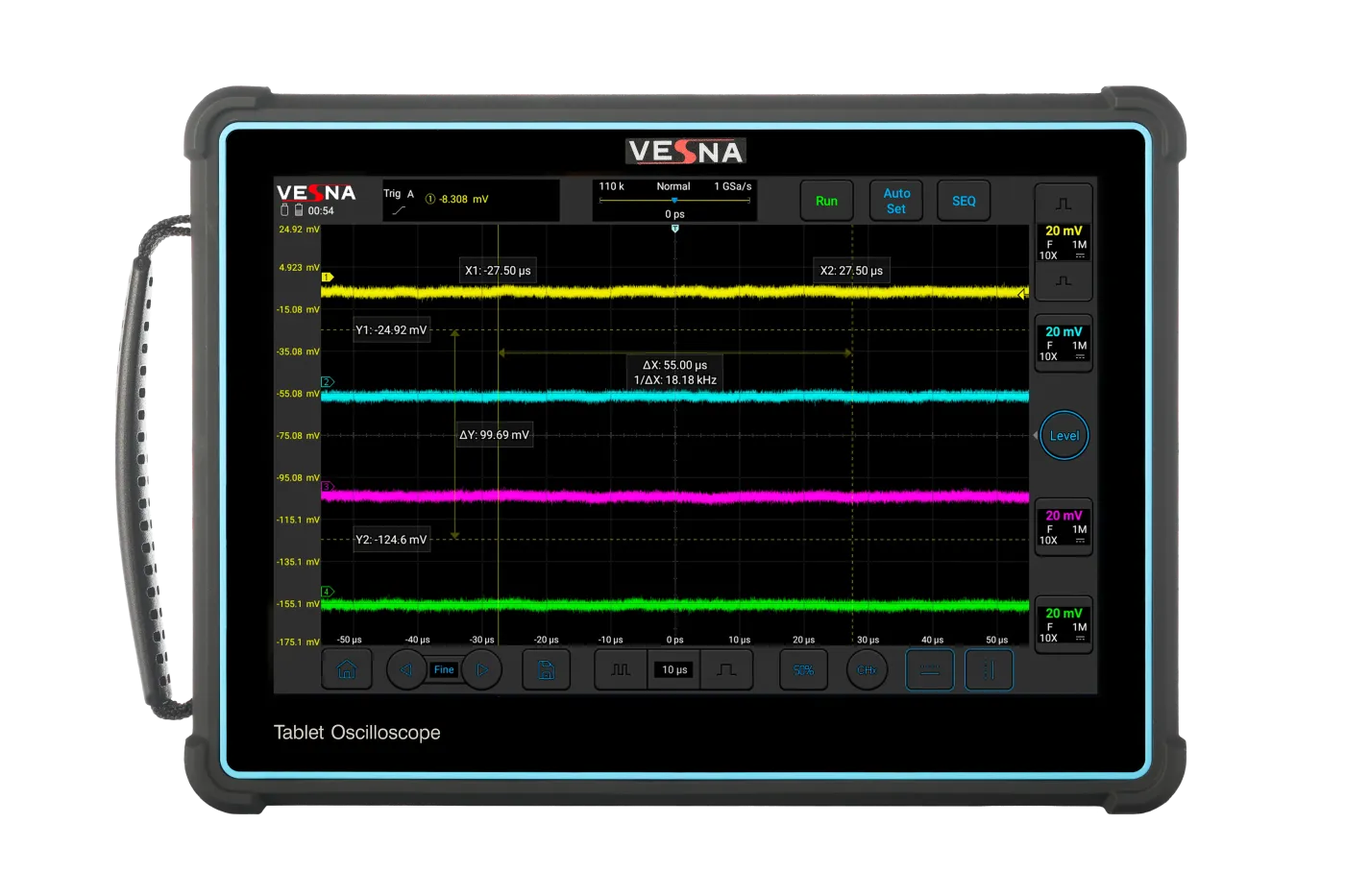 Vesna AVU2-403 — четырехканальный осциллограф портативный нового поколения с полосой 300 Мегагерц и Аналого-цифровым преобразователем 8 Бит. Частота дискретизации 2 Гигавыборки в секунду, память 220 миллионов отсчетов. Флагманская модель.