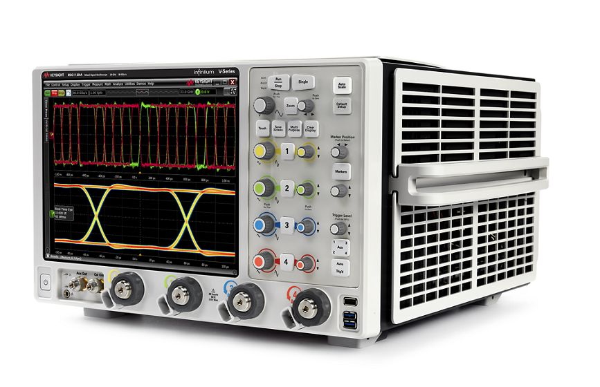 Keysight MSOV204A Infiniium серии V: осциллограф смешанных сигналов с 4 аналоговыми каналами по 20 ГГц и 16 цифровыми каналами. Он обеспечивает частоту дискретизации 80 ГВыб/с (аналог) и 1.25 ГВыб/с (цифра), а также память до 200 Мвыборок, что идеально для комплексного анализа сверхвысокоскоростных цифровых и аналоговых сигналов.