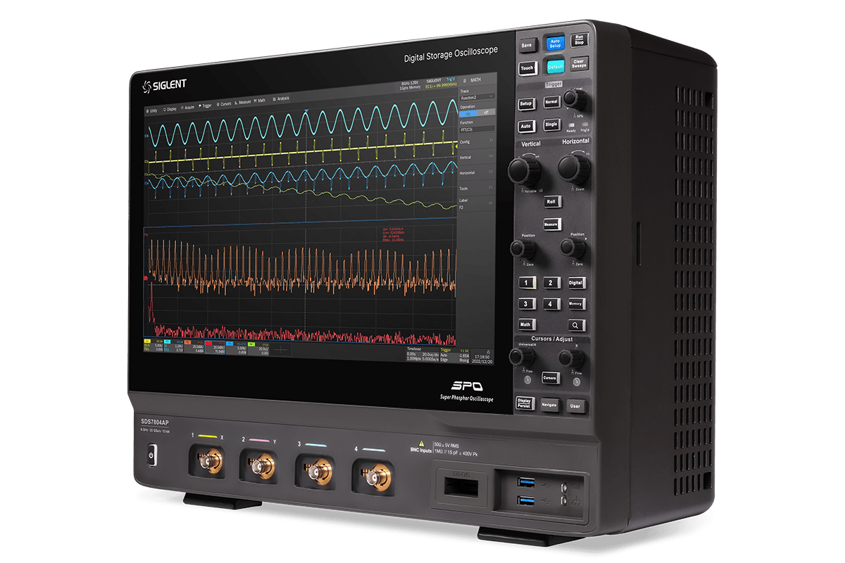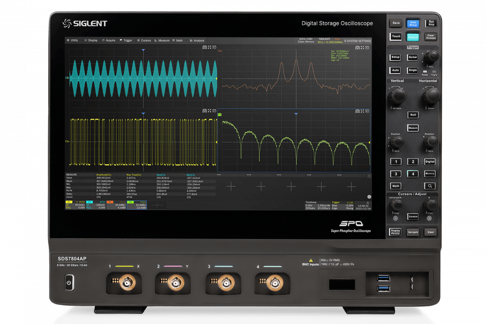 Цифровой осциллограф SDS7604AP: полоса пропускания 6 ГГц, 4 канала, 12-битный АЦП. Частота дискретизации 20 Гвыб/с, объем памяти 2 Гточек на канал. Применяется для анализа ВЧ-сигналов в телекоммуникациях и R&D.
